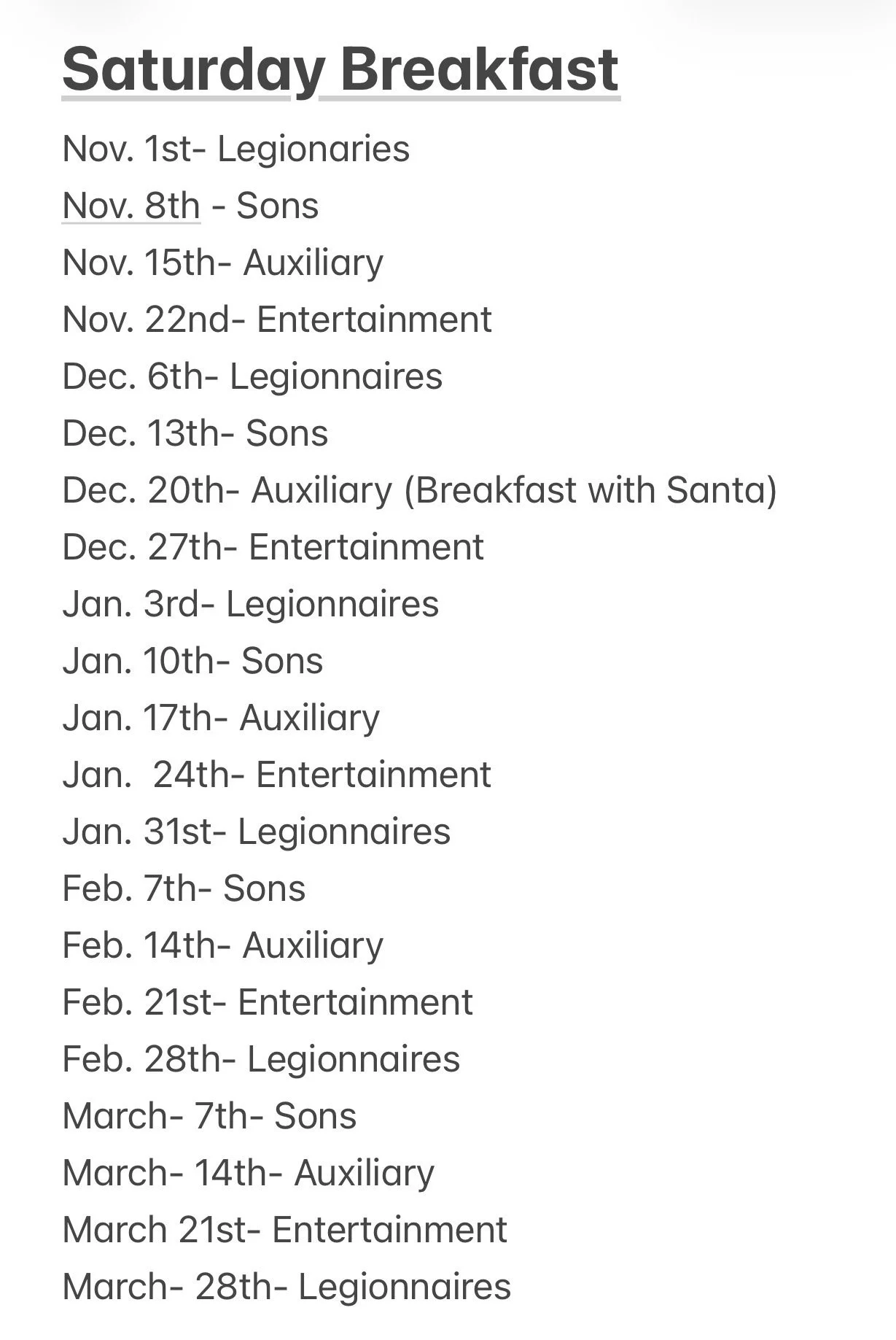 Saturday Breakfast To volunteer to help please sign up at the Darlington Legion or CallJohn Roche (765) 366-4221Michael Morrison (765) 918-4102Jeremy Weliever (765) 230-6365Kim Carpenter (765) 376-3766